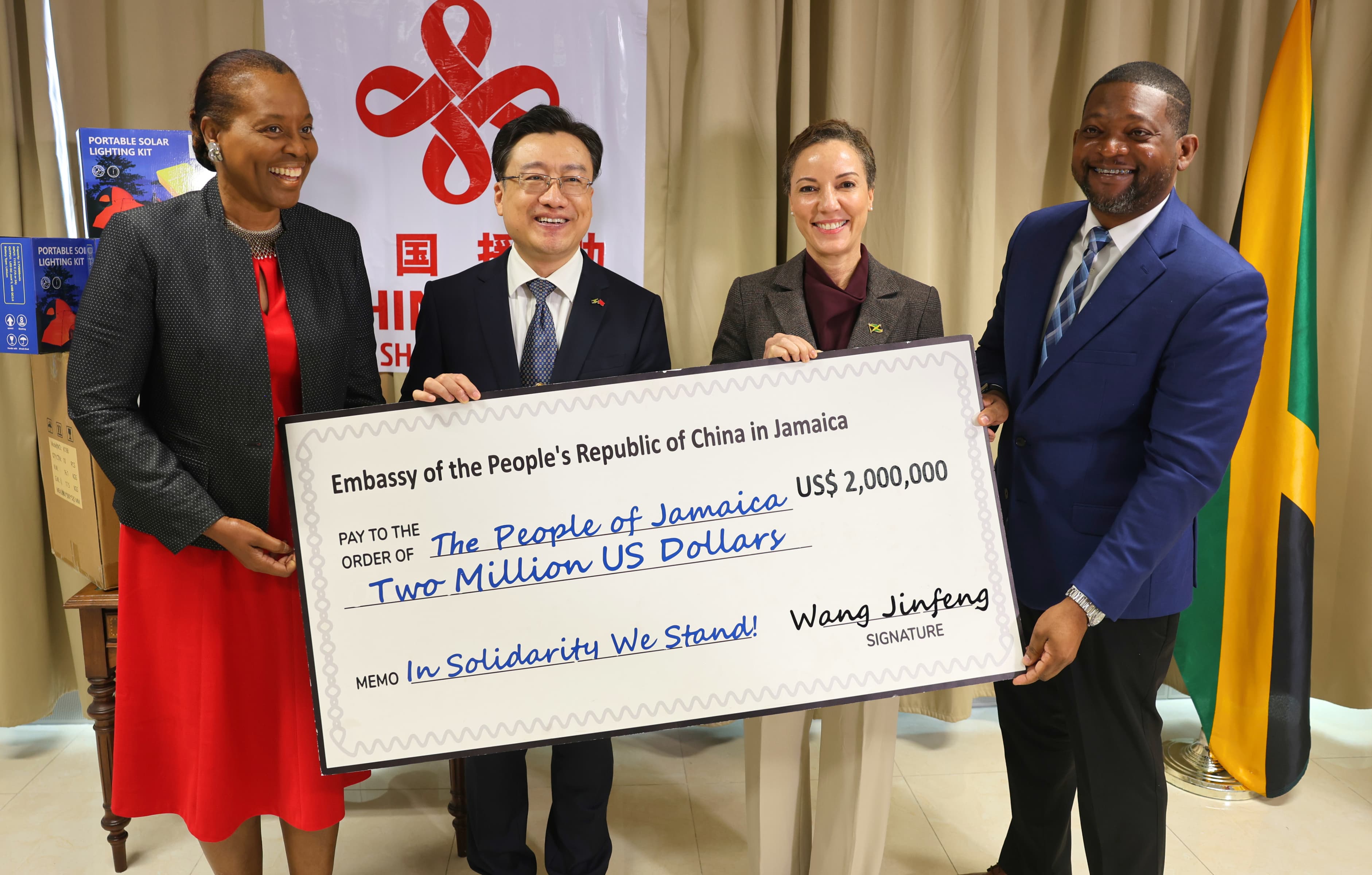 王有莉参赞陪同驻牙买加大使王锦峰出席“梅丽莎”飓风灾后中方现汇援助和物资交接仪式