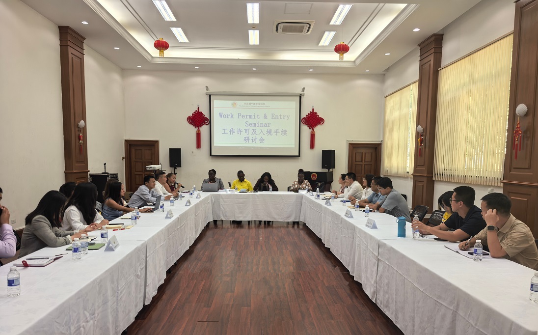 2026年4月14日,王有莉参赞出席牙买加中国企业协会在使馆举办的研讨会并致辞。牙劳工和社会保障部、牙移民局负责官员,在牙中资企业代表参会,双方就工作许可及入境签证有关政策进行互动交流。
